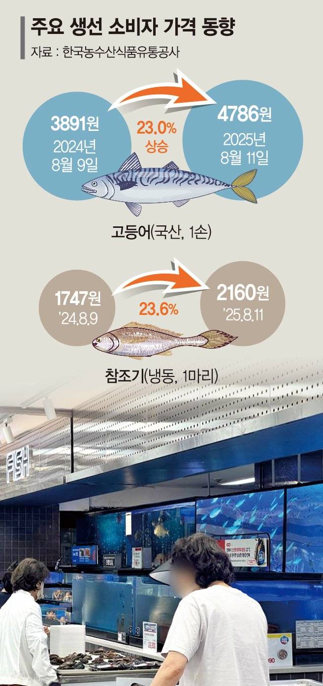 업계 관계자는 "국산 고등어는 4~5월 금어기로 5월 말까지 생물 어획이 없었고, 금어기 해제 이후에도 수온 상승으로 어획량이 줄고 작은 사이즈 위주로 잡히고 있다"며 "제주 저층 냉수대에 어장을 형성하는 참조기도 사정이 비슷하다"고 설명했다.