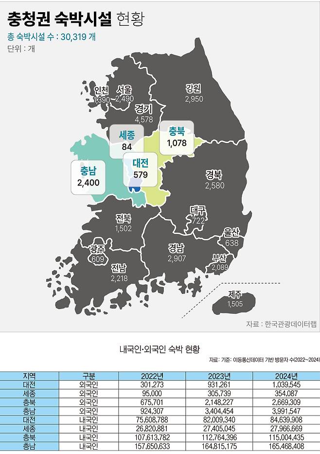 방문자 증가세가 충청권 전역에 걸쳐 두드러지고 있는 만큼 숙박 인프라 불균형 해소를 통한 체류형 관광 활성화가 시급하다는 분석이다.