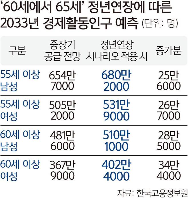 법적 정년을 5년 늘리는 효과로 55세 이상 전체 경제활동인구가 2033년 52만3000명 늘어날 것이란 분석이 나왔다. 정년 연장에 따른 경제활동인구 증가의 영향은 남성보다 여성이 더 컸다.