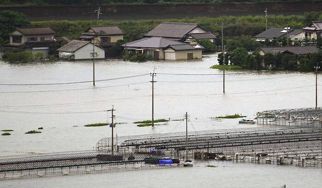 ▲ 11일 기록적인 호우로 침수된 구마모토 다마시의 모습