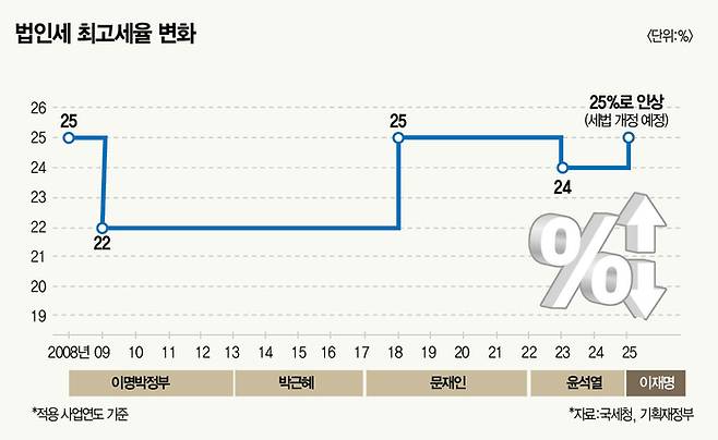 정부가 법인세 인상을 담은 세제 개편안을 확정하자 산업계는 발을 동동 구른다. 이재명정부는 윤석열정부에서 내려간 법인세 세율을 전 구간 1%포인트씩 올리기로 했다. 정부는 지난 7월 말 세제발전심의위원회 회의를 거쳐 이런 내용의 개편안을 발표했다. 전임 윤석열정부에서 추진된 감세를 되돌려 세수 기반을 다지는 방향이다. 법인세 과세는 전년도 사업소득을 기준으로 한다. 전 구간 세율을 올리는 만큼 규모와 관계없이 모든 기업 세 부담이 늘게 돼 산업계는 비상이 걸렸다.