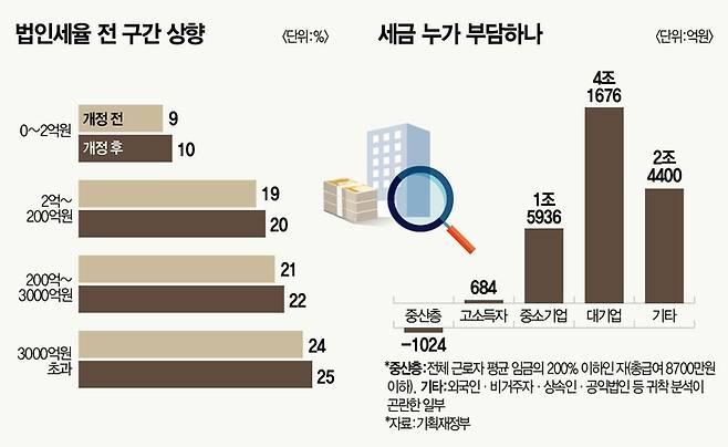 정부·여당이 법인세 전 구간 세율을 1%포인트씩 올리기로 하자 재계와 시장에서는 우려가 팽배하다. 그렇지 않아도 미국발 고율 관세로 비용 부담 우려가 커진 마당에 법인세마저 올라 이중고에 처했단 지적이다. 자본 여력이 취약한 중소·중견 수출 업체마저 세 부담에 노출돼 수출 채산성 악화를 우려하는 시선이 늘고 있다.