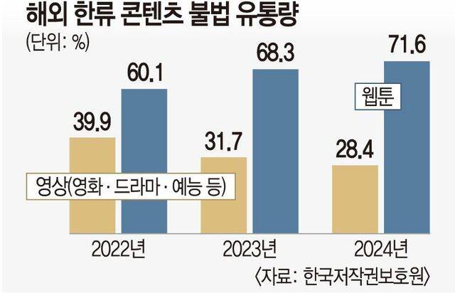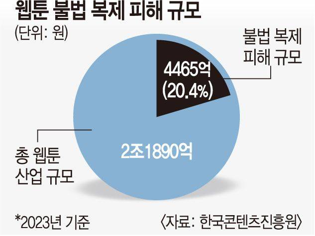 K-콘텐츠의 수출 규모가 커지면서 불법 웹툰 피해도 늘고 있다. 한국저작권보호원에 따르면 지난해 해외 한류 콘텐츠 불법 유통 사이트에 게시된 불법 복제물 중 71.6%(2억9650만개)가 웹툰인 것으로 조사됐다. 전년(68.3%·2억3873만개) 대비 복제물 개수와 비중 모두 증가한 것이다. 한국콘텐츠진흥원은 2023년 기준 불법 웹툰 유통 피해액을 약 4465억원으로 추산했다. 웹툰 업계 관계자는 “웹툰 미리보기 회차를 불법으로 퍼간 것을 적발해 삭제하면 실제로 그 전 주 대비 미리보기 매출이 오른다”고 전했다.