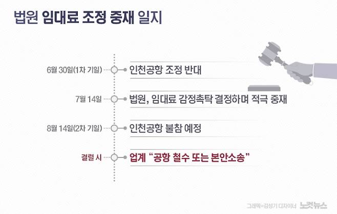 그러나 인천공항 측은 지난 6월 30일 법원의 1차 조정에 이어 오는 14일 2차 조정기일에도 참석하지 않을 것으로 알려졌다. 인청공항 측은 과거 공개입찰로 입점 계약이 성사됐던 만큼, 다른 면세사업자들과의 형평성 문제와 계약 신뢰성 등을 이유로 일방적 인하에 동의할 수 없다는 입장이다.