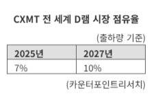 CXMT는 HBM을 포함해 D램 시장에서 영향력을 확대해가고 있다. 2016년 설립된 신생 D램 업체지만, 미국의 대중국 반도체 제재가 시작된 2020년 이후 공격적으로 생산능력(캐파)를 확장하고 있다. 시장조사업체 카운터포인트리서치에 따르면 CXMT의 전 세계 D램 시장 점유율(출하량 기준)은 올해 7%에서 오는 2027년에는 10%까지 성장할 것으로 전망됐다. CXMT는 지난해 말부터 범용 D램은 물론, DDR5과 같은 최신 규격 제품을 출시하는 등 추격의 고삐를 죄고 있다. 카운터포인트리서치는 "범용 D램 시장에서 중국 CXMT가 무섭게 추격하고 있고, HBM 경쟁도 더욱 치열해지고 있다"고 분석했다.