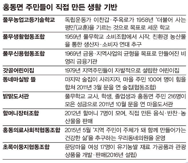충남 홍성군 홍동면은 주민 3276명이 사는 평범한 농촌 마을이다. 한국에서 처음으로 대안학교와 협동조합, 유기농업, 지역신문이 들어선 마을이기도 하다. 2025년 8월 현재 40여 협동조합과 100여 소모임이 활동한다.
