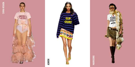 티셔츠는 오랫동안 디자이너들의 메시지를 전달하는 캔버스 역할을 해왔다. '조용한 럭셔리’와 미니멀리즘에 밀려 한동안 자취를 감췄던 슬로건 티셔츠가 트렌드 전면에 등장했다. 2017년, 'We should all be feminists(우리는 모두 페미니스트가 되어야 한다)’라는 문구를 가슴에 새긴 티셔츠로 패션 역사에 길이 남을 장면을 만든 디올은 이번 시즌, 하우스를 대표하는 향수에서 따온 'J’adore(쟈도르)’ 티셔츠로 예술적 유산을 재해석했다. 성적 정체성과 인종 차별에 꾸준히 목소리를 내온 아시시는 'Up yours(엿 먹어)’라는 도발적인 슬로건으로 사회적 억압과 권위에 저항했다. 유머러스한 접근도 눈에 띈다. 마크공은 관광지 기념 티셔츠의 대명사 'I ♥ NY(아이 러브 뉴욕)’를 차용한 ‘I ♥ Markgong money & boys(나는 마크공의 돈과 남자들을 사랑해)’ 문구의 티셔츠로 위트를 더했다. 이 외에도 'You can dance! Anywhere(어디서든 춤출 수 있어)’ 메시지를 담은 그래픽으로 발레코어 트렌드를 녹인 치카키사다와 'Knitting girl(뜨개질하는 소녀)’ 자수로 브랜드의 정체성을 각인시킨 스웨잉니트도 있다.