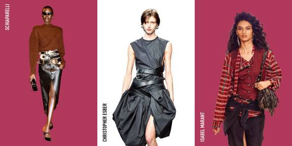 이번 시즌 키 아이템으로 급부상한 벨트. 겹치고 꼬고 늘어뜨리는 건 물론 큼직한 장식을 더해 존재감을 각인시키며 스타일의 중심에 섰다. 크리스토퍼에스버는 올 블랙 룩에 여러 개의 가죽 벨트를 둘러 분방한 매력을 강조했고, 질샌더는 크림색 니트 스웨터에 가죽 벨트를 길게 늘어뜨린 뒤 체인과 키 링으로 장식해 힙한 무드를 살려냈다. 벨트는 Y2K 스타일의 단골 아이템이기도 하다. 가죽 벨트와 스카프 조합으로 보헤미안적인 터치를 더한 이자벨마랑, 니트 스웨터와 스커트에 웨스턴풍의 버클 벨트를 겹겹이 둘러 록 시크 무드를 연출한 스키아파렐리가 대표적인 예다. 단정한 맥시 코트에 큼지막한 가죽 백팩 2개를 매달아 스타일 반전을 꾀한 페라가모의 벨트 룩도 흥미를 끌었다.