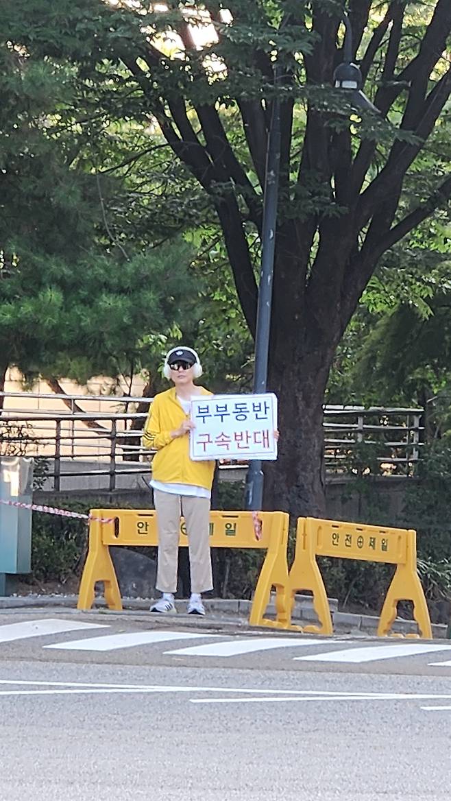 아크로비스타 앞에서는 한 지지자가 '부부동반 구속반대' 팻말을 들고 섰다. 맞은편 서울중앙지방법원 쪽 인도에는 10명 안팎의 지지자들이 태극기, 성조기와 'YOON AGAIN!'이라고 쓰인 깃발을 흔들었다. 이들은 "민중기 불법 특검, 중단하라" 등의 구호를 외쳤다.