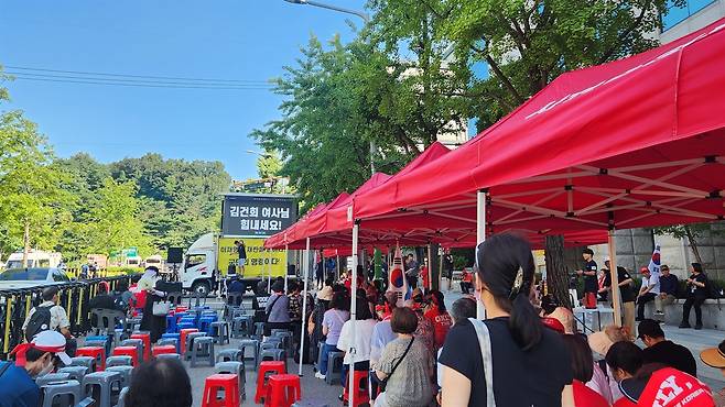 서울중앙지방법원 정문 앞에는 윤석열·김건희 부부 지지자들 120명가량이 모였다. 이들은 집회 차량 전광판에 '김건희 여사님 힘내세요!'를 띄운 채 "윤석열 대통령님 끝까지 지키겠습니다", "김건희 여사님 힘내세요" 등의 구호를 외쳤다.