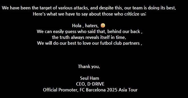 이에 대해 디드라이브는 바르셀로나의 아시아 투어 계약 체결 때부터 음해하고 방해하려는 세력이 있었지만 결국 시간이 진실을 증명한다며 이번 투어가 성공적이었다고 반박했다.