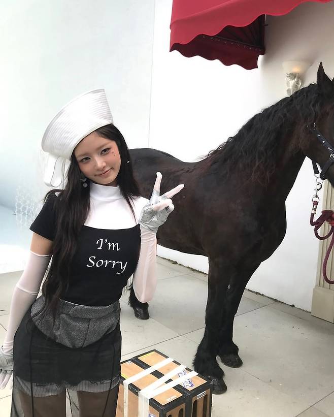 검은 말을 배경으로 선 레이는 이전보다 부드러운 표정과 함께 브이 포즈를 취했다. 고급스러운 비주얼 속에서 장난기 어린 제스처가 묘한 반전을 더한다.