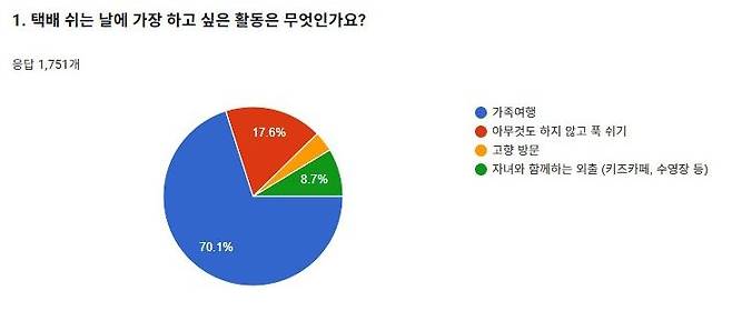 CJ대한통운 배송 기사들은 '택배 쉬는 날' 가장 선호하는 활동을 묻자 ▲ 가족여행(70.1%) ▲ 다른 계획 없이 푹 쉬기(17.6%) ▲ 자녀와 외출(8.7%) ▲ 고향 방문(3.6%) 순으로 답했다.