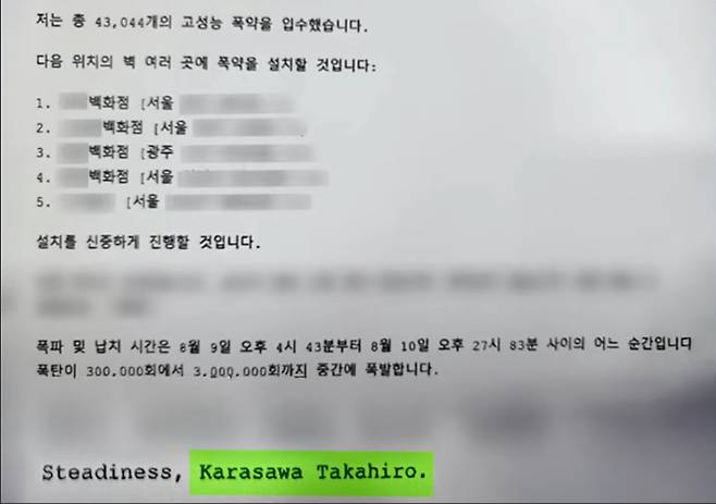 ◇ 김현정> 한번 보여주세요. 팩스의 전문을 저희가 좀 보여드리겠습니다. "저는 총 4만 3,044개의 고성능 폭약을 입수했습니다. 다음 위치 벽 여러 곳에 폭약을 설치할 것입니다. 1 무슨 백화점, 2 무슨 백화점, 3 무슨 백화점, 4 무슨 백화점 설치를 신중하게 진행할 것입니다." 쭉 쓴 다음에 마지막만 영어로 가라사와 다카히로 이렇게 적었어요.