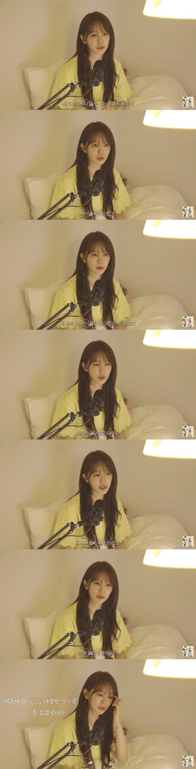 그러면서 "어차피 제대로 학교 다니지 못 할 거면 제가 최선을 다 할 수 있는 학교가 좋겠다 싶었다. 그래서 사이버 대학 가는 게 제 안의 마음이 어렵지는 않았던 것 같다"고 솔직하게 털어놨다.