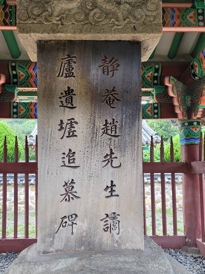 | ▲ 정암 조광조 유허비 1667년(현종8년) 우암 송시열이 비문을 짓고 동춘당 송춘길이 글씨를 쓰고 능주목사 민여로가 비를 세웠다. |