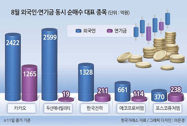 이 밖에도 8월 들어 외국인 투자자가 661억원어치 순매수하고, 연기금이 114억원어치 순매수한 에코프로비엠도 외국인·연기금 동시 순매수세가 뚜렷한 이차전지 섹터 대표 종목이다. 포스코퓨처엠의 경우에도 외국인·연기금 투자자가 각각 370억원, 238억원어치 주식을 동시 순매수했다.