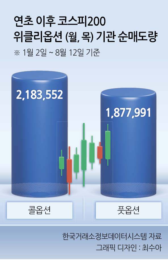 12일 한국거래소 정보데이터시스템에 따르면 연초부터 8월 11일까지 코스피200 위클리옵션(월요일·목요일 만기)에서 기관투자자의 콜옵션 순매도 물량은 218만3352건에 달했다. 같은 기간 풋옵션 순매도량은 187만7911건으로, 위클리 콜옵션 매도 포지션 쏠림이 뚜렷하다.