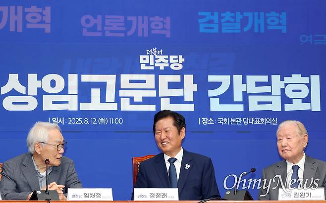 정청래 민주당 당대표 취임 이후 처음으로 열린 민주당 상임고문단 간담회에서 임채정·문희상·정세균 전 국회의장은 에둘러 정청래 대표에 쓴소리를 아끼지 않았다.