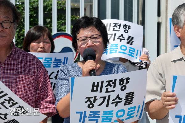 평양시민 김련희씨가 12일 서울 세종로 정부서울청사 앞에서 열린 비전향장기수 2차송환 촉구 기자회견에서 2차송환을 희망하는 6명의 비전향장기수와 본인의 송환을 정부에 촉구하는 발언을 하고 있다. 2025.8.12. 정지윤 선임기자