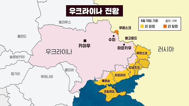 그리고 앞서 언급했듯 이제 우크라이나 동부의 도네츠크뿐만 아니라 루한스크 지역과 크림반도를 러시아에 완전히 넘기는 조건으로 휴전에 나설 수 있다, 이런 제안을 한 것으로 알려졌습니다. 노란색 부분, 즉 우크라이나 영토의 약 5분의 1이 러시아가 점령한 영토로 분류가 되는데요. 참고로 크림반도는 이 전쟁이 시작되기 전에 러시아가 점령을 한 지역입니다.