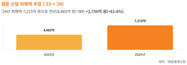지난해 기준 불법 유통으로 인한 웹툰산업 피해액은 7215억원으로 집계됐다. 지난 2023년 피해액(4465억원)을 크게 웃돈다. 뉴토끼 뿐만 아니라 북토끼를 통해서도 웹소설이 공유되고 있어 실제 피해액은 더 클 것으로 추정된다.
