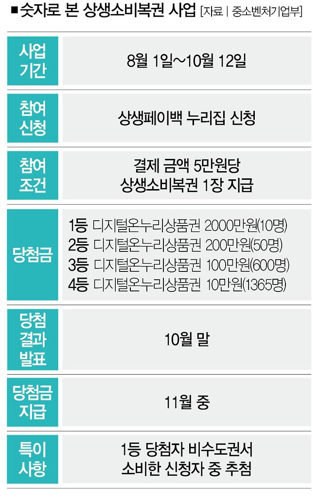 이 기간 중에 전통시장이나 소상공인 매장 등에서 소비한 누적 카드 결제 금액을 기준으로 5만원 당 상생소비복권 1장을 지급한다.