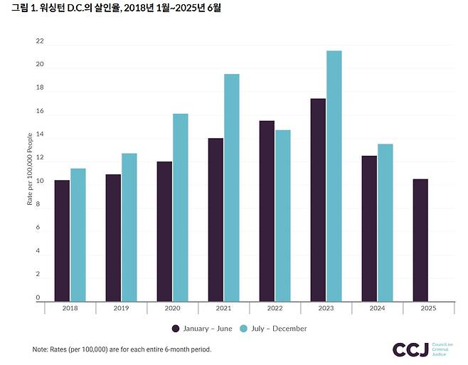 | ▲ 워싱턴DC 2018년 1월~2025년 6월 인구 10만 명 당 살인사건 비율. 2023년 하반기를 정점으로 감소추세를 보이고 있다.(자료 : 미국 형사사법위원회) |