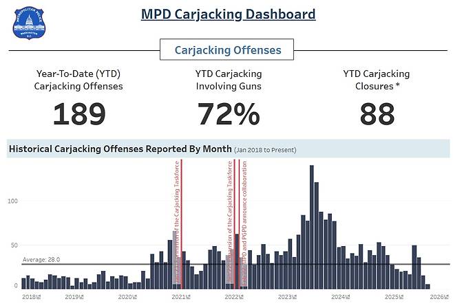| ▲ 워싱턴 D.C. 자동차 강탈 사건 대시보드. 2023년 이후 감소 추세를 보이고 있고 올해 들어서는 8월 11일까지 189건이 발생했다. |