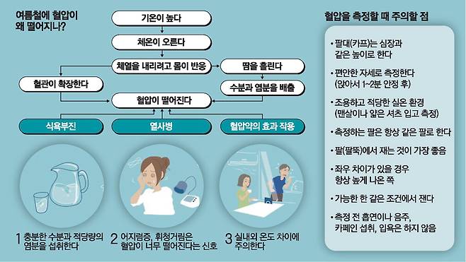 고혈압약을 복용 중인 사람이 여름철 저혈압이 자주 나타나면 의사와 상담을 하고 혈압약 종류와 양을 일시적으로 조절할 필요가 있다. 고혈압 치료에 사용하는 약에는 '칼슘길항제(심근이나 평활근 수축 억제)'나 '레닌·안지오텐신계(RAS) 저해제' 등 혈관확장제, '이뇨제' 등 혈액량을 줄여 체내 수분량을 줄이는 약이 있다. 땀을 많이 흘리는 환경에 있는 사람이라면 의사와 상담을 통해 이뇨제 중지, 칼슘길항제 감축을 검토하고, 수축기 혈압이 125㎜Hg 정도로 유지되도록 조절하는 것이 바람직하다. 혈압약 조절은 2~3주간 가급적 매일 혈압을 측정해 혈압 변화를 의사에게 보고한다. 혈압 측정은 하루 2회로, 아침에는 화장실 볼일을 끝내고 아침식사를 하기 전, 밤에는 식사·목욕 직후를 피하고 가능한 한 같은 시간대에 측정한다.