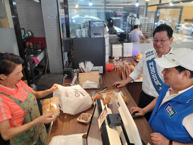 | ▲ 김태선 더불어민주당 울산시당위원장이 '민생회복 소비쿠폰 사용 독려 캠페인' 중 전통시장에서 물건을 구매하며 의견을 듣고 있다. |