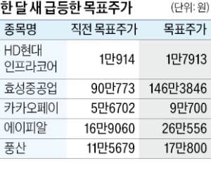 이 밖에 카카오페이(5만6702원→9만700원), 에이피알(16만9060원→26만556원), 풍산(11만5679원→17만800원) 등의 목표주가도 올랐다. 카카오페이는 금융 서비스 부문의 실적 개선세로 하반기에도 흑자 전환이 유력하다. 에이피알은 수출 호조로 올해 영업이익 전망치가 2411억원에서 3068억원으로 한 달 새 27.25% 늘어났다. 풍산 역시 방산 부문 실적이 개선되며 올해 영업이익이 3477억원으로 전년 대비 증가할 것으로 예상된다.