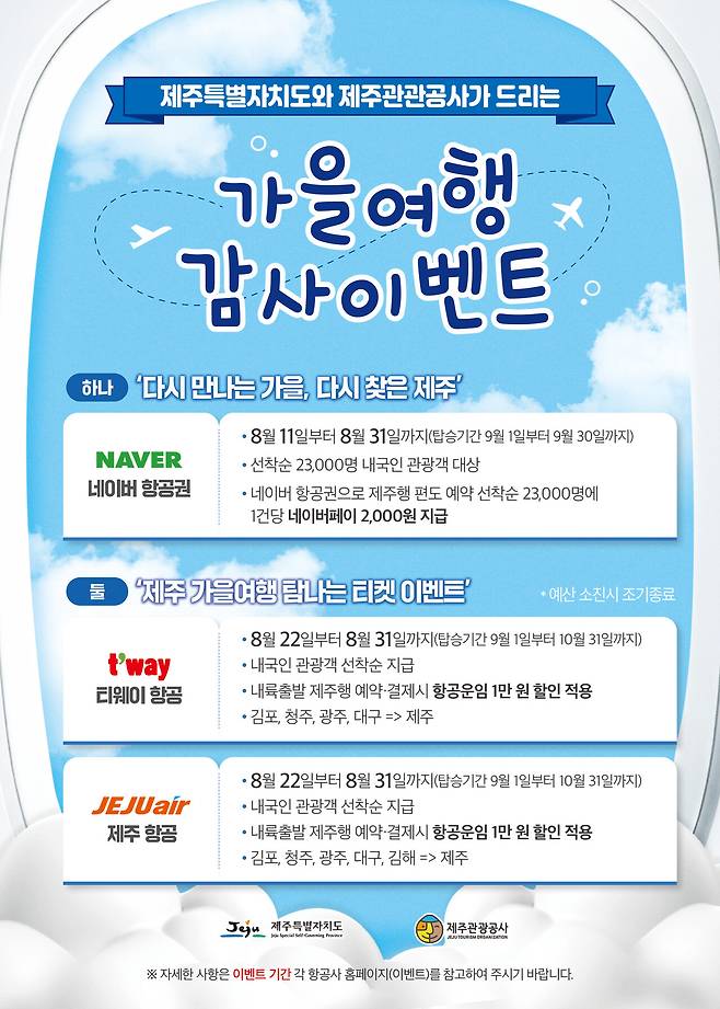 관광공사는 "가을 제주 여행을 계획하는 내국인 관광객에게 항공기 부담 완화와 같은 혜택을 제공해 지속적인 제주 방문을 유도할 계획"이라며 "제주 여행 편의와 만족도를 높이고, 제주 관광의 매력을 높일 수 있는 마케팅 활동을 확대하겠다"고 말했다.
