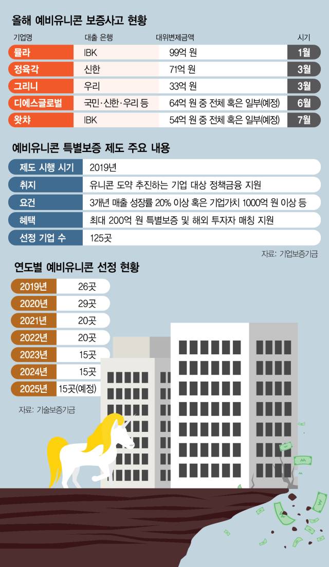 문제는 예비유니콘의 보증사고가 앞으로도 늘어날 가능성이 크다는 점이다. 김건희 여사의 ‘집사게이트’ 의혹에 연루된 IMS모빌리티(옛 비마이카) 역시 2020년 예비유니콘에 선정된 기업이다. 지난해 말 기준 누적 결손금이 1275억 원에 달하며 완전자본잠식 상태다. 이 회사는 기보의 보증을 통해 우리은행, 기업은행, 신한은행에서 총 82억 원의 대출을 받았다.최근 유동성 위기로 서비스를 일시 중단한 새벽배송 업체 팀프레시도 2021년 예비유니콘 명단에 이름을 올린 바 있다.
