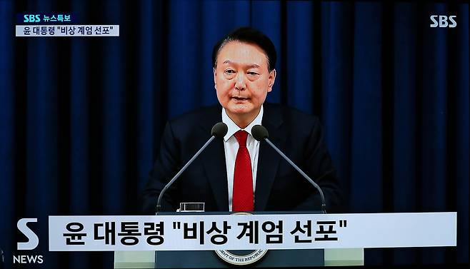 | ▲ 윤석열 대통령, 비상계엄 선포 윤석열 대통령이 2024년 12월 3일 밤 서울 용산 대통령실 청사에서 비상계엄을 선포하고 있다.(텔레비젼 촬영) |