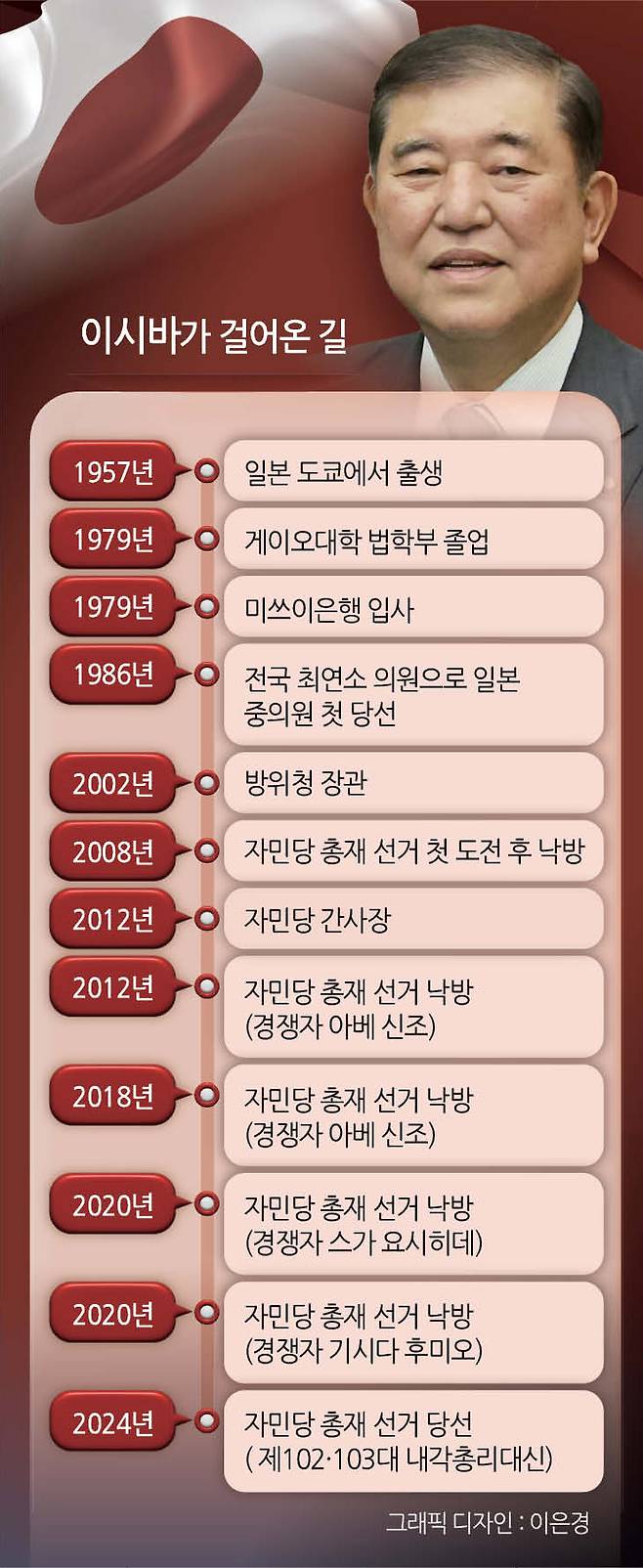 그러다 마지막 도전이었던 지난해 자민당 총재 선거에서 이시바 총리(당시 자민당 전 간사장)는 결선투표 끝에 당선된다. 이시바 총리는 당 총재 선거 결선투표에서 전체 유효표 409표의 절반을 넘는 215표를 얻었다.