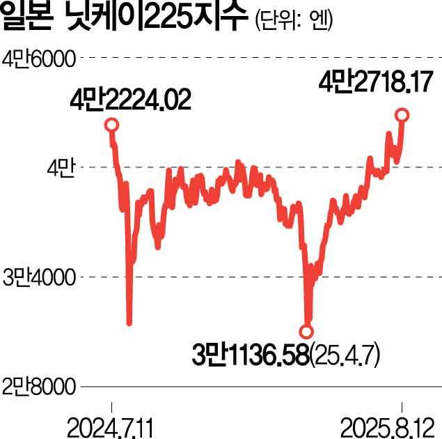 12일 닛케이지수는 직전 거래일보다 2.15% 오른 4만 2718엔으로 장을 마감했다. 이로써 지난해 7월 11일 세운 종가 기준 최고치인 4만 2224엔을 1년여 만에 갈아치웠다. 닛케이지수는 이날 장중 한때 4만 2999엔까지 올랐다. 올해 4월 초 미국 관세정책 여파로 3만 1000엔 선까지 떨어졌으나 미일 관세 협상 마무리 이후 연일 상승 곡선을 그리고 있다.