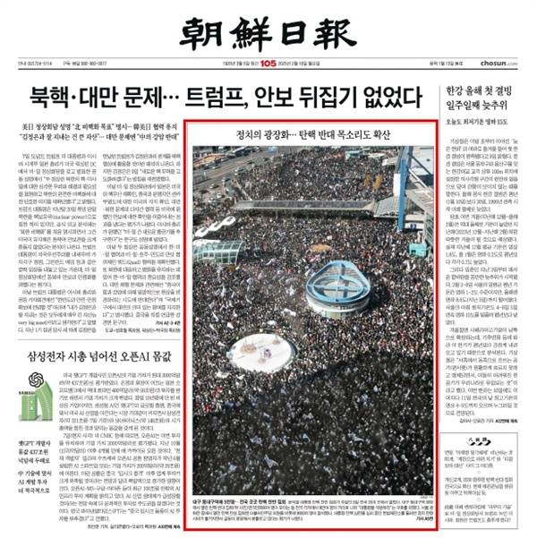 | ▲ 1면 한가운데 탄핵반대 집회 사진을 크게 실은 조선일보(2/10) |