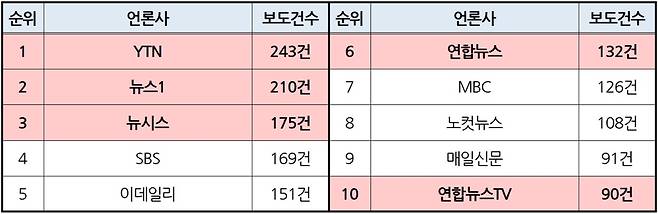 | ▲ 윤석열 탄핵심판 ‘따옴표 기사’ 보도건수 상위 10개 언론사(1/14~2/26) ※뉴스통신사와 보도전문채널은 붉은색 표시 |