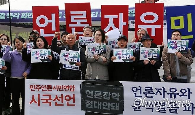 | ▲ 3월 13일 오후 서울 종로구 서십자각터 윤석열 즉각퇴진 사회대개혁 비상행동 단식 농성장 앞에서 민주언론시민연합 주최로 열린 '윤석열 파면 촉구 시국선언'에서 참석자들이 "언론자유와 민주주의 이름으로 윤석열 파면"을 선언하고 있다. |