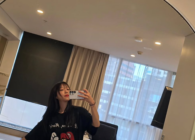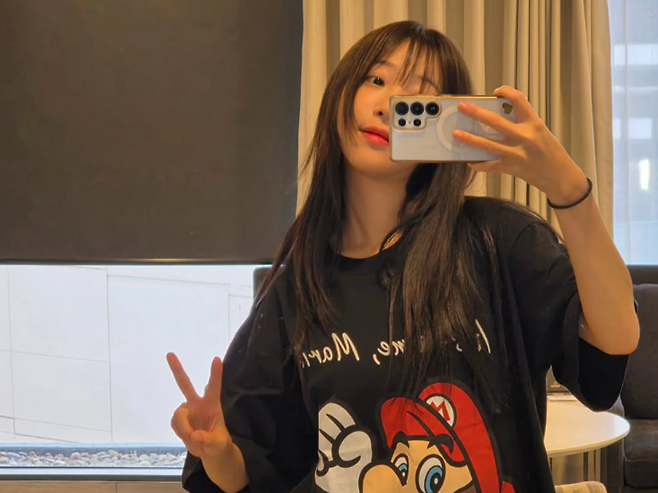 사진 속 쯔양은 오버사이즈 티셔츠를 입고 거울 셀카를 찍고 있다. 쯔양은 특유의 동안 미모를 뽐내며 브이 포즈로 장난기 있는 표정을 짓고 있다.