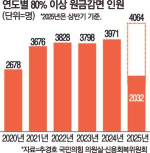 12일 국회 정무위원회 소속 추경호 국민의힘 의원이 신용회복위원회에서 받은 자료에 따르면 지난해 신복위에 개인워크아웃(채무조정)을 통해 대출 원금 80% 이상을 감면받은 사람은 3971명이다.