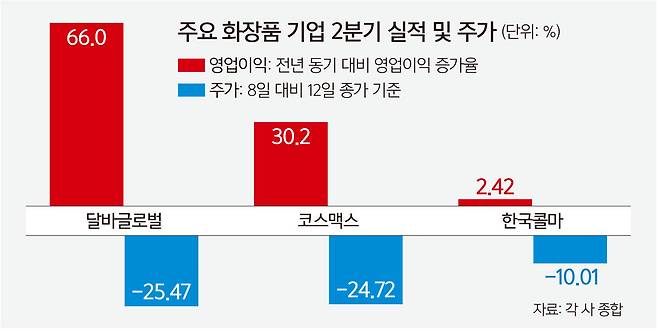 프리미엄 비건 브랜드로 젊은 여성 고객들에게 인기를 끌며 급성장한 달바글로벌도 시장의 박한 평가를 면치 못했다. 달바글로벌은 5월 상장한 이후 두 달 새 주가가 270%가량 급등하며 상승세를 거듭했다. 전년 동기보다 매출은 74%, 영업이익은 66% 오른 2분기 실적을 발표한 이후로 투자금이 대거 빠져나갔다. 주가는 내려갔지만 업계에선 달바글로벌 성장이 당분간 이어질 것으로 보고 있다. 달바글로벌도 해외 시장 중요성을 고려해 덩치를 키우고 수익성은 높이기로 했다. 일본·러시아·미국·유럽·아세안 등지에서 코스트코, 얼타, 세포라, 왓슨스 등 주요 글로벌 오프라인 채널 입점을 확장할 계획이다.