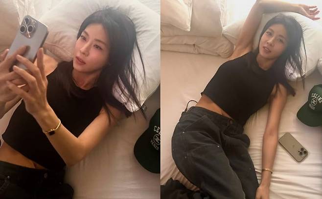 사진 속 하지원은 침대 위에 누워 셀카 삼매경에 빠진 모습이다. 블랙 민소매 탑에 와이드 팬츠를 매치한 하지원은 탄탄한 몸매는 물론 세월을 거스른 동안 미모로 여전한 아름다움을 뽐냈다.