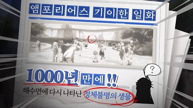 내레이션이 "모든 이야기의 시작처럼 그날은 예상대로 뜻밖의 일이 일어났지"이라고 말하자 히실렌스가 수면 위로 떠올랐다. 히실렌스의 등장은 수많은 앰포리어스 사람들의 눈길을 사로잡았다. 앰포리어스 기이한 일화라며 1000년 만에 해수면에 정체불명의 생물이 다시 나타났다는 기사도 나왔다.