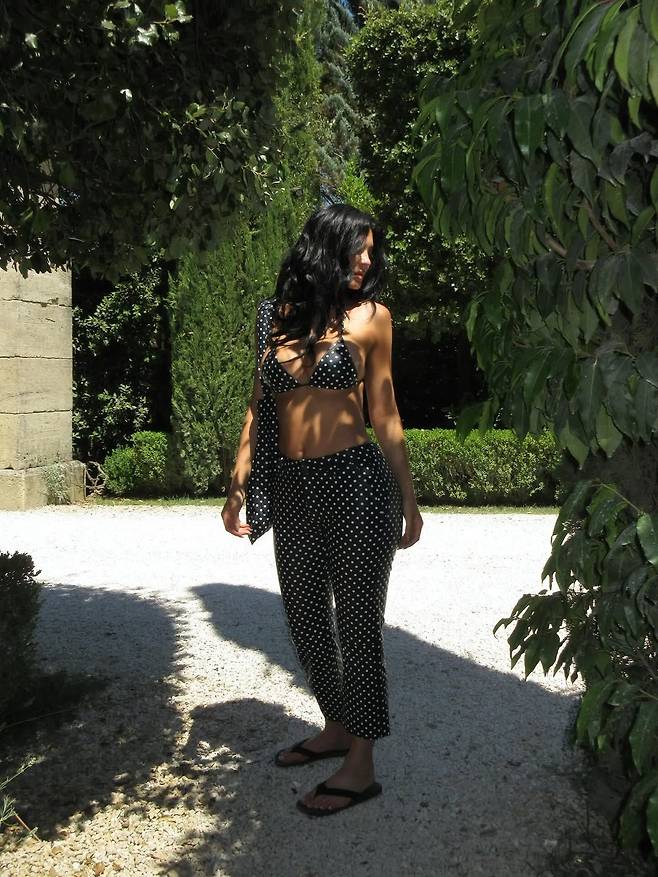카일리의 바캉스 룩 은 블랙 앤 화이트 도트 패턴의 브라 톱과 팬츠 셋업으로 귀결됩니다. 플립플롭으로 힘을 뺀 덕분에, 패턴의 경쾌함과 블랙의 시크함이 자연스럽게 어우러지죠. 휴양지에서도 고급스러운 무드를 뽐내고 싶다면 블랙을 챙기는 일을 잊지 마세요.