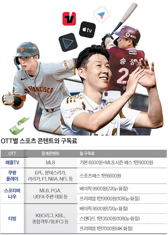 열혈 축구 팬인 직장인 K씨(27)는 매일 밥값에서 1000원씩 아끼기로 했다. 월급 수령액은 200만원 조금 넘는데, 예상 밖의 지출이 생겼다. 새로운 온라인동영상서비스(OTT)에 가입하게 된 거다. K씨는 그간 OTT인 쿠팡플레이를 유료 구독해 잉글랜드 프리미어리그(EPL) 토트넘의 손흥민 출전 경기를 시청했다. 이달 초 손흥민이 토트넘에서 미국 메이저리그사커(MLS) 로스앤젤레스(LA)FC로 이적한 게 ‘화근’이었다. 쿠팡플레이로는 MLS 중계를 볼 수 없었다. 손흥민을 보기 위해 또 다른 OTT인 애플TV에 추가로 가입했다.