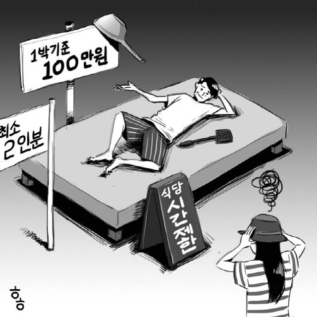 이달 들어 춘천의 한 펜션 1박 숙박 요금 134만원(2인 기준), 강릉·홍천을 비롯한 다른 지역에서도 성수기 주말 1박 요금이 펜션 100만 원대, 호텔 200만 원대까지 치솟았다. 일부 모텔도 비수기 대비 3배 이상 오른 40만 원 안팎이었다. 이게 다 사실이라면 과연 기꺼이 지불할 수 있는 선일까 싶다. 속초에서는 한 식당에서 식사 시간을 재촉하고 메뉴를 강요하는 장면의 영상이 나와 논란이 됐다. 결국 영업정지를 당하고 지역 상인들은 자정 결의를 열고 수습에 나섰다.