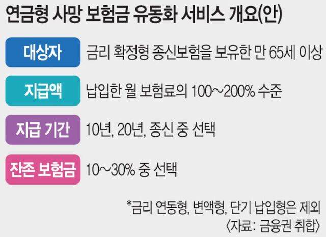 사망 보험금 유동화 서비스는 사망 시 받을 보험금을 연금 형태로 유동화해 고객에게 납입액의 100~200%를 돌려주는 ‘연금형’과 요양 시설 등에 입소 가능한 상품권 형태로 받는 ‘서비스형’으로 나뉜다. 생명보험협회, 주요 보험사 등과 실무 태스크포스(TF)를 꾸려 논의 중인 금융 당국은 준비 기간이 비교적 짧은 연금형을 오는 10월 다섯 개 보험사 고객을 대상으로 우선 내놔 서비스를 개시한다는 목표를 세웠다.