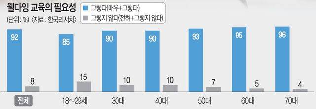이 같은 인식 변화는 각종 조사에서도 확인된다. 한국리서치가 지난달 발표한 조사에서 ‘죽음을 준비하는 것이 삶의 일부’라는 응답은 89%에 달했다. ‘죽음을 진지하게 생각해본 적이 있다’는 응답도 84%나 됐다. 특히 92%는 ‘죽음이나 웰다잉 교육이 필요하다’고 답했다. 이는 죽음을 주체적으로 인식하고 제도적 지원을 요구하는 흐름이 세대 전반으로 확산했음을 보여준다.